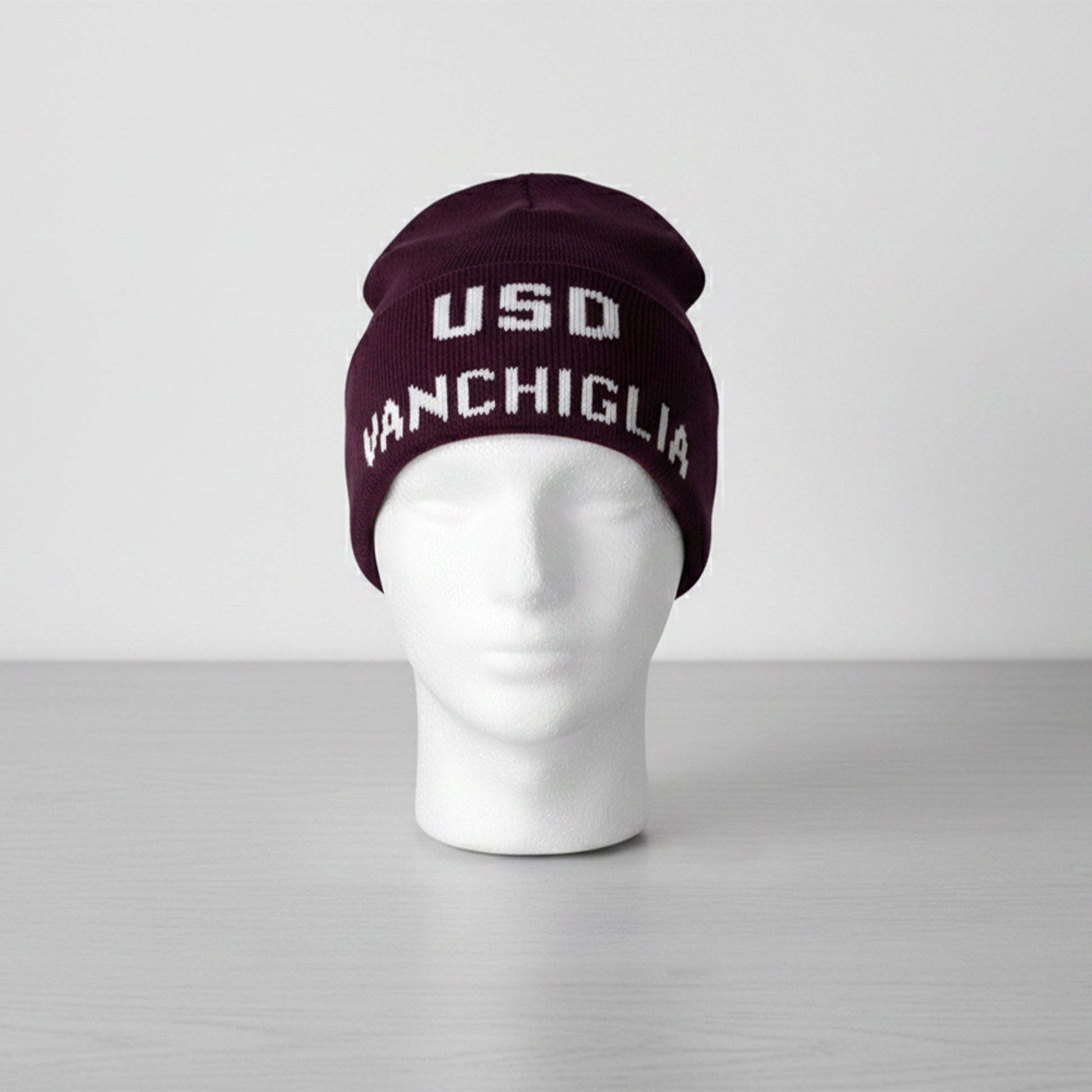 Realizzato in lana lavorata a maglia, garantisce calore, comfort e traspirabilità, risultando perfetto sia per le giornate più fredde allo stadio sia per l’uso quotidiano. Il design essenziale, in colore granata con scritta bianca “USD Vanchiglia”, richiama con orgoglio l’identità storica del club.